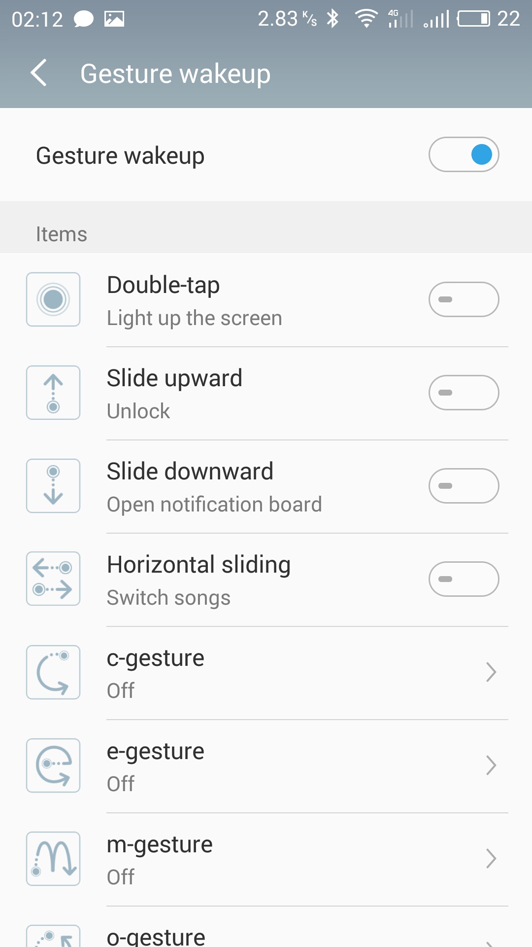 - Gesture wakeup – คำสั่งบนหน้าจอเวลาที่ปิดอยู่ อาทิแตะ 2 ครั้งเพื่อปลุกหน้าจอ, ลากจากล่างขึ้นบนเพื่อปลดล็อค, ลากเป็นตัวอักษรเพื่อเปิดแอพที่เลือก แต่ถ้าเลือกเปิดฟีเจอร์นี้จะมีผลกับแบตเตอรี่ที่จะหมดเร็วขึ้นด้วยนะ