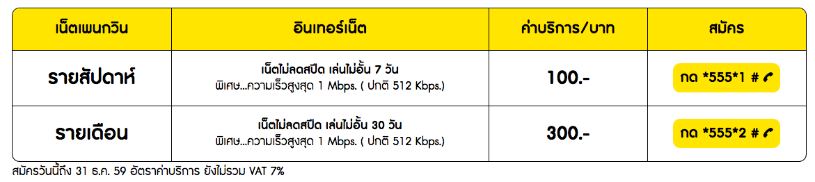- ค่าบริการอินเทอร์เน็ต คิดตามการใช้งานจริง โดยสูงสุดวันละ 20 บาท ที่ความเร็วสูงสุด 1 Mbps. สำหรับ 10,000 ซิมแรก ของทุกจังหวัด (ความเร็วเน็ตปกติ 512 Kbps.)