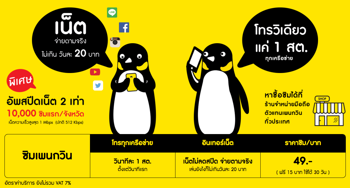 - ซิมเพนกวินราคา 49 บาท จะได้รับโทรฟรี 15 บาท วันใช้งาน 30 วัน จะใช้บริการได้หลังจากได้รับการยืนยัน ทาง SMS ภายใน 24 ชั่วโมง สามารถเปิดใช้บริการได้ตั้งแต่วันนี้ถึง 31 ธันวาคม 2560