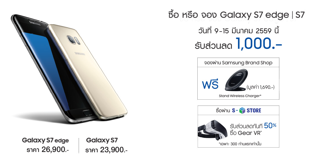 - ลูกค้าสามารถทำการสั่งซื้อ Galaxy S7 edge หรือ Galaxy S7 ล่วงหน้า ผ่านทาง www.s-estore.com/preorder/s7 รับส่วนลด 1,000 บาท พร้อมรับส่วนลด 50% ซื้อ Gear VR ทันที สำหรับการสั่งซื้อในวันที่ 9 – 15 มีนาคม 2559
