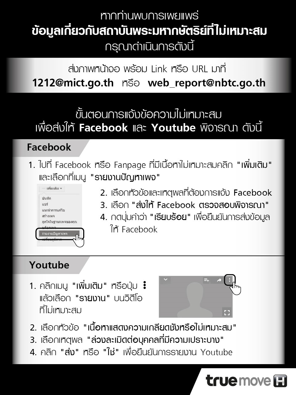ทางสำนักงานคณะกรรมการกิจการกระจายเสียง กิจการโทรทัศน์ และกิจการโทรคมนาคมแห่งชาติ หรือ กสทช. ได้ขอความร่วมมือผ่านทาง 3 โอเปอเรเตอร์ ทั้ง เอไอเอส, ดีแทค และทรูมูฟ เอช ประชาสัมพันธ์ข้อมูลเกี่ยวกับกับการจัดการกับเว็บ, บุคคลใน Facebook หรือคลิปใน Youtube ที่มีเนื้อหาที่ไม่เหมาะสมหรือ หมิ่นต่อสถาบันพระมหากษัตริย์ โดยมีแนวทางในการแจ้งและดำเนินการรายงานดังต่อไปนี้