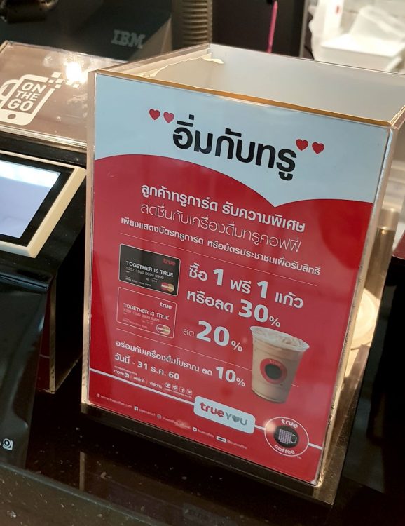 ทางทรูมีร้านกาแฟที่ชื่อว่า True Coffee มีสาขาอยู่ไม่น้อย กระจายอยู่ในเมืองและทั่วประเทศ ส่วนตัวผมเป็นคนที่ชอบกินกาแฟแล้วก็ไปนั่งทำงานตามร้านกาแฟต่างๆ อยู่เป็นประจำ สิทธิของ Black card กับ True Coffee ก็ถือว่าค่อนข้างคุ้มมากๆ เพราะสามารถเลือกรับเป็นส่วนลด 30% ทุกเมนู หรือจะเลือกเป็นซื้อเครื่องดื่ม 1 แถม 1 ก็ได้ สำหรับคอกาแฟแล้วถือว่าว่าคุ้มมาก เพราะกาแฟก็ถือว่ารสชาติดี แถมยังมี Seasoning menu ใหม่ๆ มาให้ชิมอยู่เสมอ