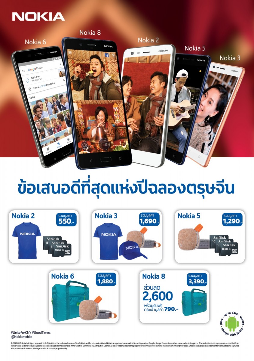 พบกับสมาร์ทโฟนรุ่นต่างๆ ที่มาพร้อม แอนดรอยด์เวอร์ชั่นล่าสุด ทั้ง Nokia 8 ที่โดดเด่นด้วยแอนดรอยด์ 8.0 Oreo และ Bothie ฟังก์ชั่นการถ่ายภาพหน้าหลังได้พร้อมกัน Nokia 6 ที่สุดของความบันเทิง Nokia 5 มาพร้อมดีไซน์กระชับจับถนัดมือ Nokia 3 เอาใจคนรักการถ่ายภาพด้วยกล้อง Auto Focus หน้าและหลัง Nokia 2 ใช้งานได้ถึง 2 วันโดยไม่ต้องชาร์จ และ ฟีเจอร์โฟน Nokia 3310 3G ที่มาพร้อมกับเกมส์งูที่คุ้นเคย ร่วมสนุกกับกิจกรรมดีๆ โปรโมชั่นสุดพิเศษรับตรุษจีน และ พร้อมรับของกำนัลมากมาย อาทิ เสื้อยืด หมวก กระเป๋า สุดเอ็กซ์คลูซีฟ เมื่อซื้อสมาร์ทโฟนรุ่นใดก็ได้จากโนเกีย