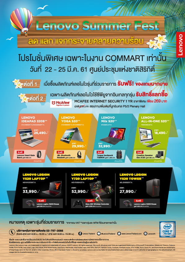 เลอโนโว จัดแคมเปญ Lenovo Summer Fest ด้วย โปรโมชั่น Lenovo Commart 2018 ราคาสุดคุ้ม ยกขบวนสินค้ากลุ่ม Think ไปจำหน่ายในราคาสุดพิเศษ และสินค้ากลุ่ม Consumer ที่เตรียมโปรโมชัน ลด แลก แจก แถม ในงาน Commart ระหว่างวันที่ 22 – 25 มีนาคม 2561 ที่บูธ เลอโนโว ห้องเพลนนารี่ ฮอลล์ ณ. ศูนย์การประชุมแห่งชาติสิริกิติ์