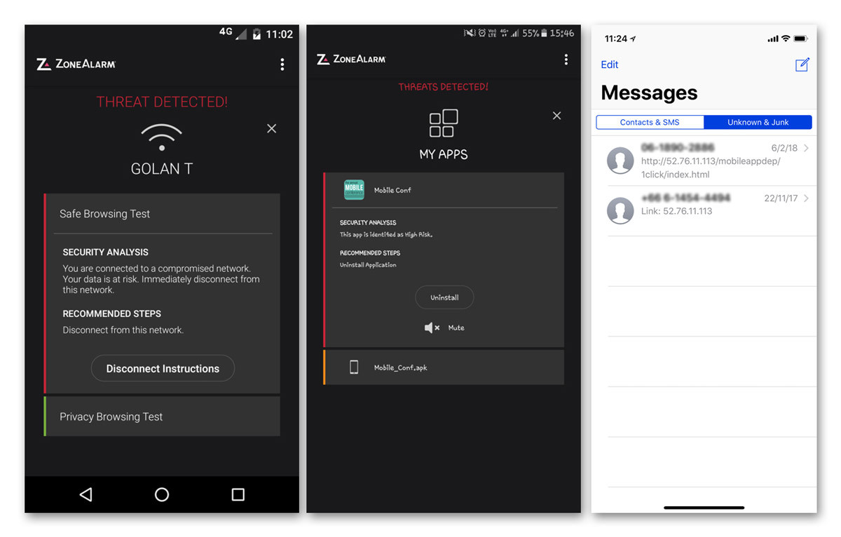 - ตรวจจับไวรัสหรือมัลแวร์ และอัปเดตภัยคุกคามใหม่ๆ อยู่เสมอ ที่อาจมาในรูปแบบของลิงค์หรือ URL โฆษณาต่างๆ จากทาง SMS ทั้งส่วนที่เป็นคอนเทนต์จากบริษัทผู้ให้บริการคอนเทนต์ และไวรัสที่แฝงมากับ SMS เหล่านั้น ZoneAlarm สามารถคัดกรอง SMS ที่มี URL เหล่านั้นได้เพื่อให้ผู้ใช้ได้เห็นก่อนที่จะไปกดลิงค์