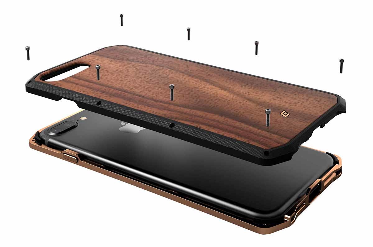 เคสตัวทอปสำหรับไอโฟน 7 /7+ หรูหราโดดเด่นสะดุดตาด้วยตัวเคสที่ผลิตจากไม้วอลนัทเนื้อแข็ง ที่มีความทนทานและสวยงาม และเป็นไม้ชนิดเดียวกับที่นิยมนำมาใช้ผลิตด้ามปืน อีลีเม้นท์เคส รุ่น กาตานา ผลิตด้วยเครื่องจักร CNC แมชชีน อลูมิเนียม ที่ให้ความแม่นยำถูกต้องทุกสัดส่วน และใช้วัสดุที่มีคุณสมบัติคงทนต่อการบิด งอ แตกหัก จึงป้องกันการกระแทกได้ดีเยี่ยม ได้แก่