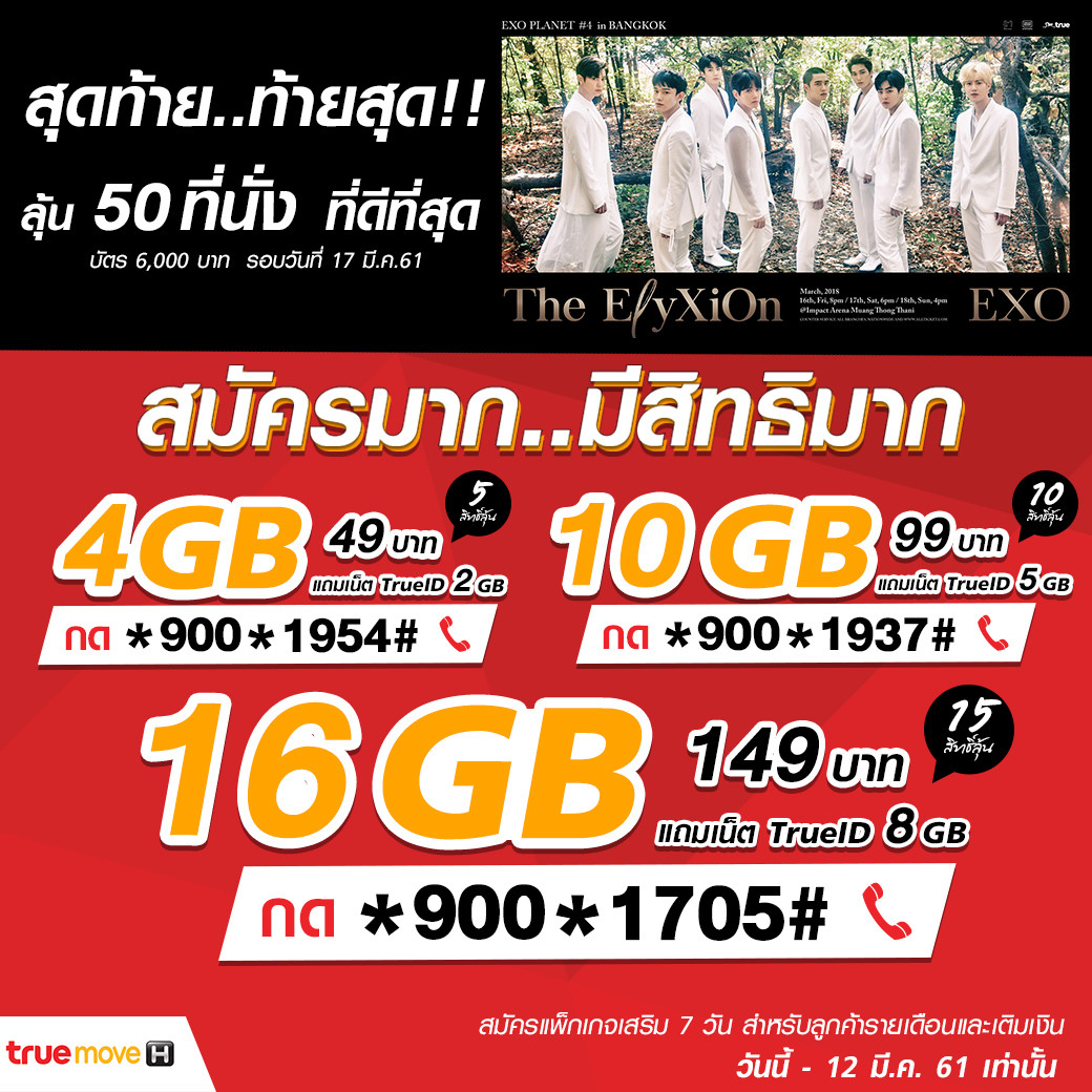 โอกาสสุดท้ายของการลุ้นเป็นเจ้าของบัตร EXO PLANET #4 – The EℓyXiOn – in BANGKOK ราคา 6,000 บาท รอบวันที่ 17 มีนาคม 2561 เพียงสมัครแพ็กเกจทรูมูฟ เอช (แบบรายเดือน และเติมเงิน) แบบ 7 วัน ภายใน 12 มีนาคมนี้เท่านั้น
