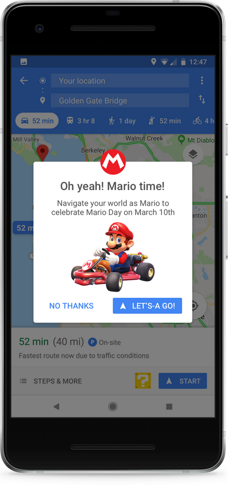 ตั้งแต่วันที่ 10 มีนาคม 2561 เมื่อผู้ใช้เปิดแอพ Google Maps ทั้งในระบบ Android และ iOS จะมีสัญลักษณ์กล่อง “?” สีทองเหมือนแบบในเกมมาริโอปรากฎอยู่ข้างๆ ปุ่มสั่งนำทาง เมื่อกดแล้ว ในเส้นทางจะมีตัวละครมาริโอ ขับรถโกคาร์ท วิ่งบนเส้นทางที่เรากำหนดไว้ด้วย ซึ่งกิจกรรมนี้ทาง Google จะเปิดให้เล่นผ่านแอพบนสมาร์ทโฟนได้เป็นเวลา 1 อาทิตย์