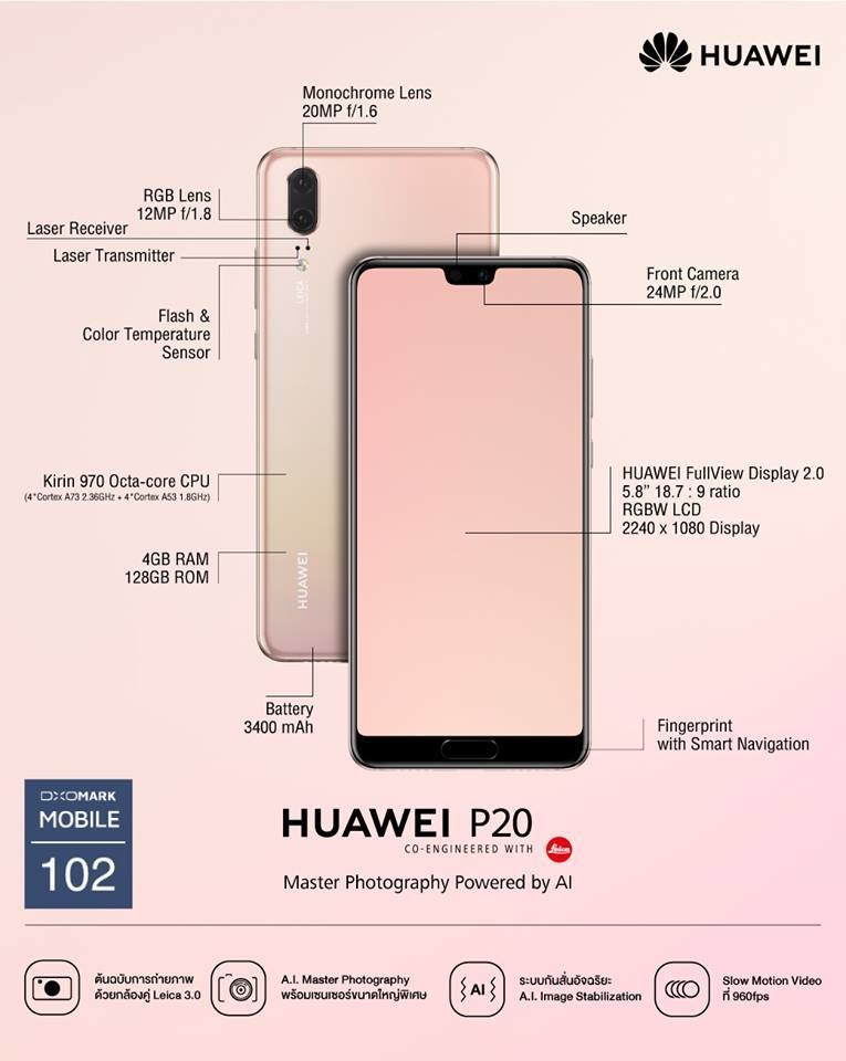 สำหรับ HUAWEI P20 สมาร์ทโฟนสองรุ่น จะมาพร้อมกับเทคโนโลยี AI ที่จะช่วยให้ผู้บริโภคยุคใหม่บันทึกและแบ่งปันความประทับใจที่เกิดขึ้นในชีวิตประจำวันได้อย่างยอดเยี่ยม โดย DxOMark เว็บไซต์ที่จัดอันดับคุณภาพของการถ่ายภาพด้วยสมาร์ทโฟน ให้คะแนนประสิทธิภาพภาพรวมของกล้อง HUAWEI P20 Pro และ Huawei P20 ที่ 109 และ 102 คะแนนตามลำดับ ซึ่งถือว่าสูงสุดในกลุ่มสมาร์ทโฟนในเวลานี้