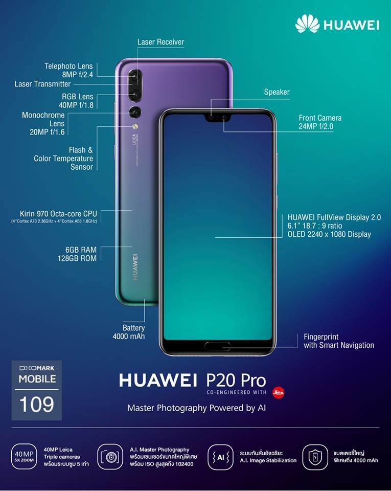 - Huawei P20 Pro (RAM 6GB + ROM 128GB) ราคา 27,990 บาท สำหรับผู้สั่งจองล่วงหน้า รับฟรี กล้อง 360 องศา Huawei EnVizion 360 VR มูลค่า 4,490 บาท