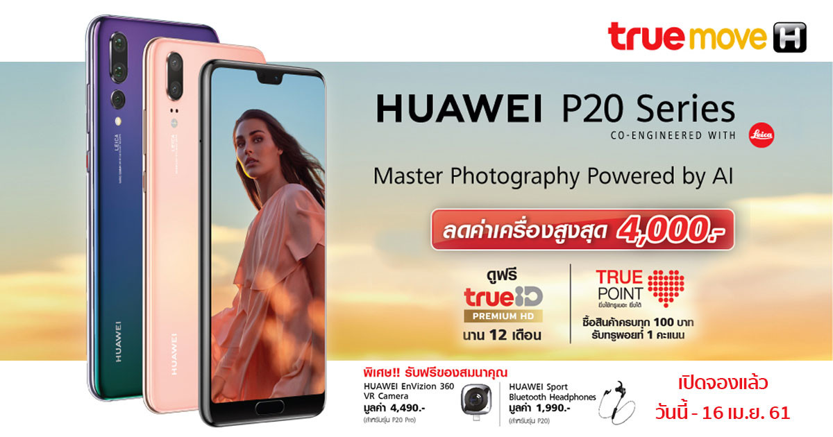 ทรูมูฟ เอช จัดโปรโมชั่นพิเศษให้กับลูกค้า ทั้งลูกค้าใหม่, ลูกค้าปัจจุบัน และลูกค้าเปลี่ยนเติมเงินเป็นรายเดือน ที่จองเครื่อง Huawei P20|P20 Pro ที่ ทรูมูฟ เอช ในวันที่ 6 – 16 เมษายน นี้ ที่ให้ทั้งส่วนลดค่าเครื่อง, ของแถมพิเศษ, ผ่อน 0% ฯลฯ