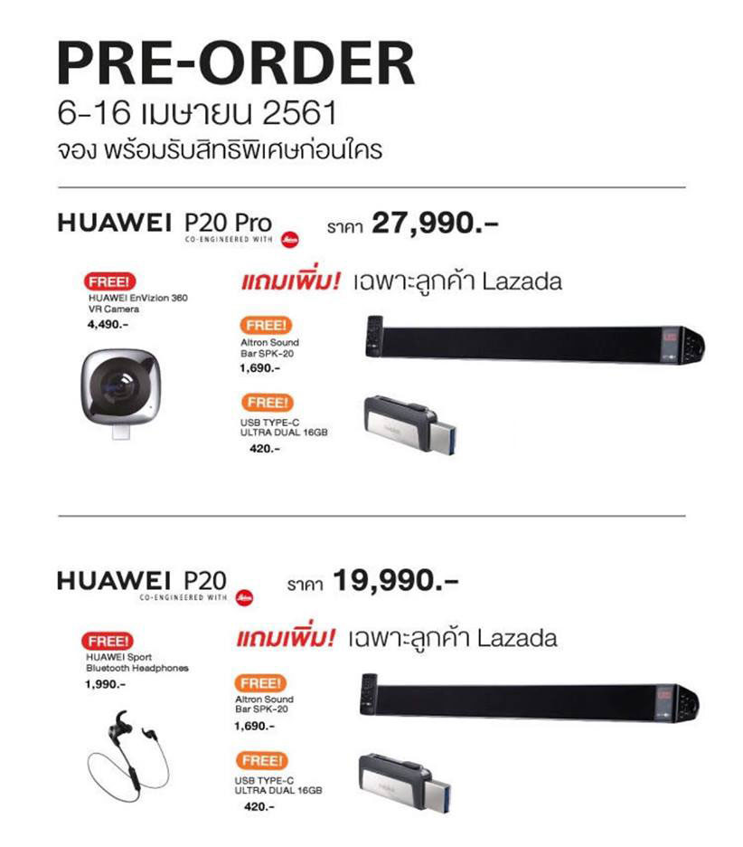 - Huawei P20 (RAM 4GB + ROM 128GB) ราคา 19,990 บาท แถมฟรีสำหรับผู้สั่งจองล่วงหน้า