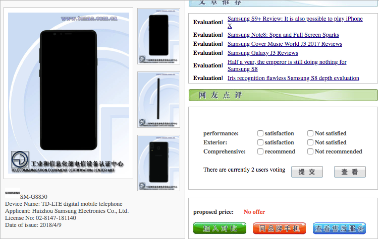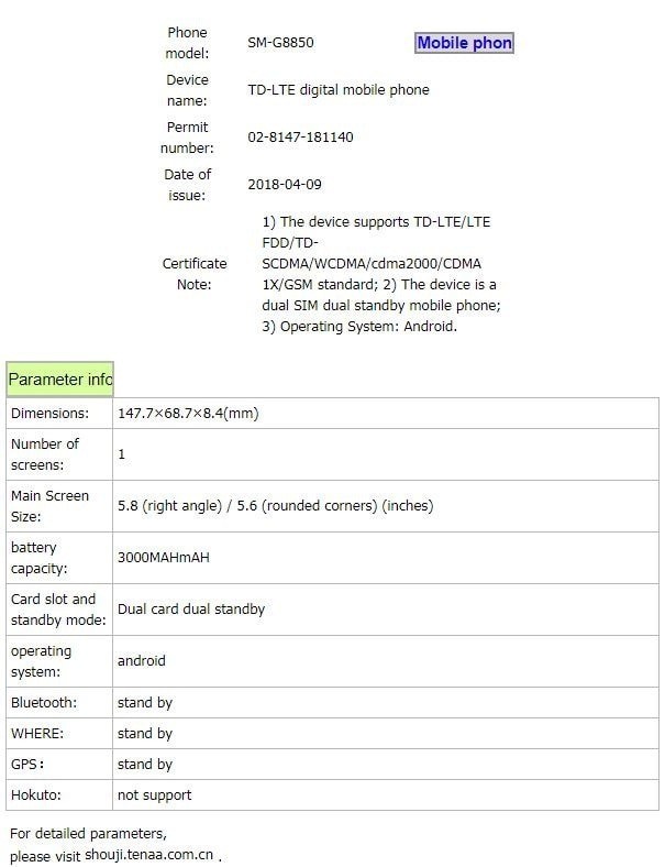 สัปดาห์ที่ผ่านมาได้มีข้อมูลเกี่ยวกับสมาร์ทโฟนของ Samsung ที่มีหมายเลขรุ่น SM-G8850 ปรากฏตัวขึ้นในโลกออนไลน์ เชื่อว่าอาจจะเป็นรุ่น Galaxy S9 Mini ที่ผ่านการรับการรับรองจาก TENAA ในประเทศจีนแล้ว