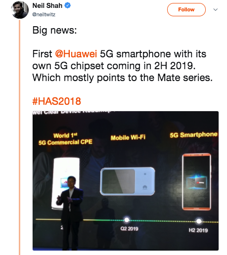 ช่วงเวลาการเปิดตัวของหัวเว่ยสอดคล้องกับการเปิดตัว 5G ทั่วโลก คาดว่าน่าจะมีการเปิดตัวในไตรมาสที่ 3 ของปี 2019 แต่อย่างไรก็ดี หัวเว่ยยังไม่ได้เปิดเผยรายละเอียดเพิ่มเติมเกี่ยวกับสมาร์ทโฟน 5G รุ่นใหม่ที่จะเปิดตัวนี้ แต่การตัดสินใจทำมือถือรองรับเครือข่าย 5G จะเป็นอะไรที่พิเศษมากๆ ไม่แน่ว่าอาจจะเป็นสมาร์ทโฟนเรือธงในซีรี่ย์ Mate ของปี 2019 ก็เป็นได้