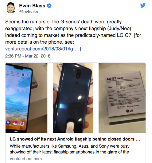 สำหรับสมาร์ทโฟนรุ่นใหม่ที่กำลังจะมาของ LG ครั้งนี้อาจใช้ชื่อเรียกว่า LG G7 (แต่ก็มีกระแสว่า LG จะหยุดสายพัฒนาซีรี่ย์ G แล้วชื่อใหม่) โดยคาดว่าอาจจะมีปุ่มเฉพาะสำหรับ AI ปัญญาประดิษฐ์และมาพร้อมกล้องด้านหลังพร้อมรูรับแสง f / 1.5