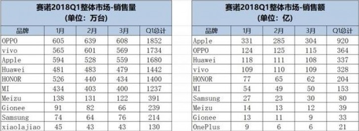 Sino บริษัทวิจัยตลาดเผยแพร่ผลการสำรวจไตรมาสที่ 1 ปี 2018 ในประเทศจีน Oppo คว้าอันดับ 1 สมาร์ทโฟนที่ทำยอดขายสูงถึง 18.52 ล้านเครื่อง ในขณะที่ Vivo นั้นก็พุ่งแรงขึ้นมาเป็นอันดับที่ 2 ด้วยยอดขายจำนวน 17.34 ล้านเครื่อง ตามมาด้วย Apple ในอันดับที่ 3 ด้วยยอดขายจำนวน 16.8 ล้านเครื่อง ตามมาด้วย Huawei และ Honor มียอดขายประมาณ 14 ล้านเครื่อง