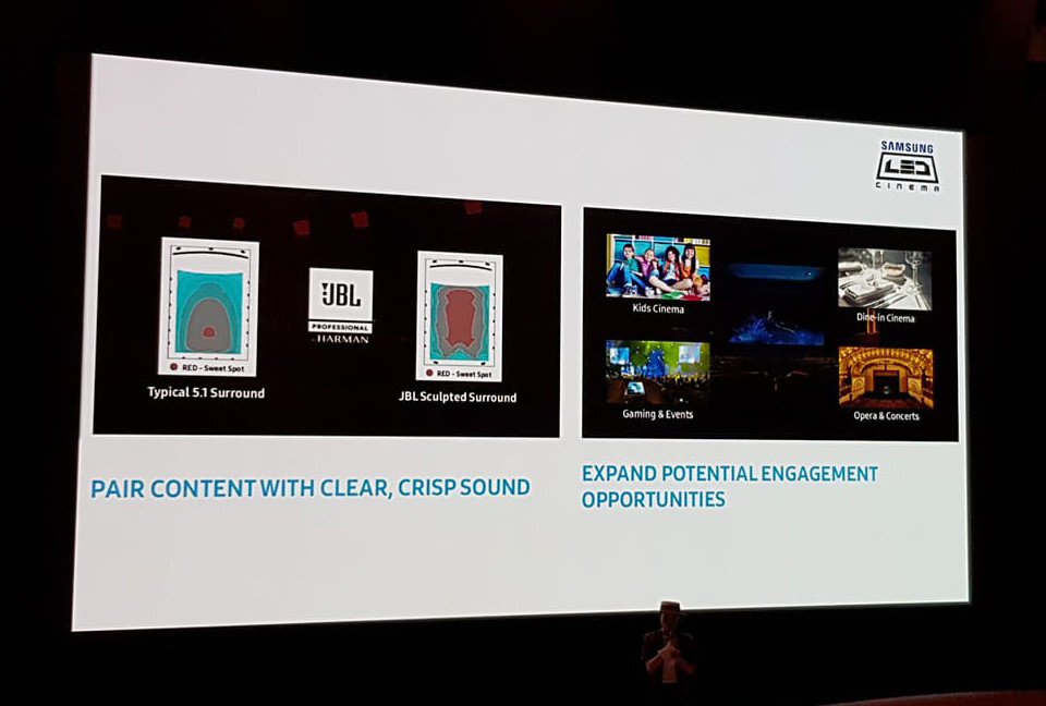 ซัมซุงซีนี่ม่าแอลอีดีได้ประสานกับเทคโนโลยีเสียงสุดล้ำจาก JBL by Harman โดยการทำงานร่วมกันในครั้งนี้ประกอบไปด้วยระบบลำโพงที่ทรงพลังเสียง และมีเทคโนโลยีด้านการประมวลผลภาพที่เป็นลิขสิทธิ์เฉพาะของจอและระบบเสียงเซอร์ราวด์จาก JBL ที่ให้ภาพและเสียงที่ไม่มีใครเทียบได้อย่างที่ผู้สร้างภาพยนตร์ต้องการ