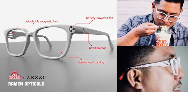 สำหรับแบรนด์บะหมี่กึ่งสำเร็จรูป นิชชิน ก็เล่นกับเค้าด้วย โดยการเปิดตัว แว่นสำสำหรับการรับประทานราเม็งโดยเฉพาะ ที่จับมือกับ Zenni Optical มาพร้อมกับแว่นตากันไอน้ำสำหรับรับประทานราเม็ง มีพัดลมที่ดึงไอน้ำออกจากเลนส์ได้ด้วย ทำเอาคนใส่แว่นกินมาม่าอยากได้ขึ้นมาทันที