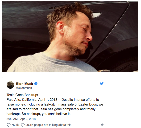 สำหรับข่าวอำสุดท้ายนี้ก็เป็นข่าวของ Elon Musk ที่ออกมาเล่นอำในวันเอพริลฟูลเดย์ด้วย แถมเล่นใหญ่รัชดาลับไม่แพ้เจ้าอื่นเลย โดยออกมาทวีตบอกว่า Tesla ล้มละลายแล้ว !! ทำเอาหลายคนตกอกตกใจว่าทำไมค่ายรถยนต์ยักษ์ใหญ่ที่กำลังไปได้ดีถึงล้มละลาย แต่ก็มีคนหัวไวคิดได้ว่าต้องเป็นเรื่องเอพริลฟูลแน่ๆ ฮ่าๆๆ