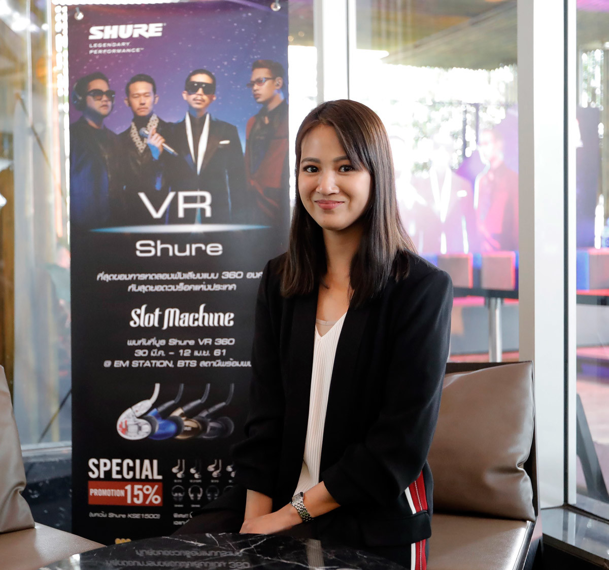 คุณอิงค์ ทิยา กาญจนชัยภูมิ Business Development Manager บริษัท มหาจักรดีเวลอปเมนท์ จำกัด ได้ให้สัมภาษณ์กับทางสื่อมวลชนถึงที่มาของการจัดงานในครั้งนี้ “โดยหูฟัง SHURE เป็นหูฟังที่ได้รับความนิยมอยู่แล้ว ทั้งในหมู่นักดนตรี และมืออาชีพ เป็นหูฟังที่ค่อนข้างแน่นคุณภาพดีเราก็เลยอยากจะให้ทุกท่านได้ลองสัมผัสกับคุณภาพเสียงที่แท้จริง และก็เป็นการ Introduce วง Slot Machine เป็น Brand Ambassador อีกด้วย”