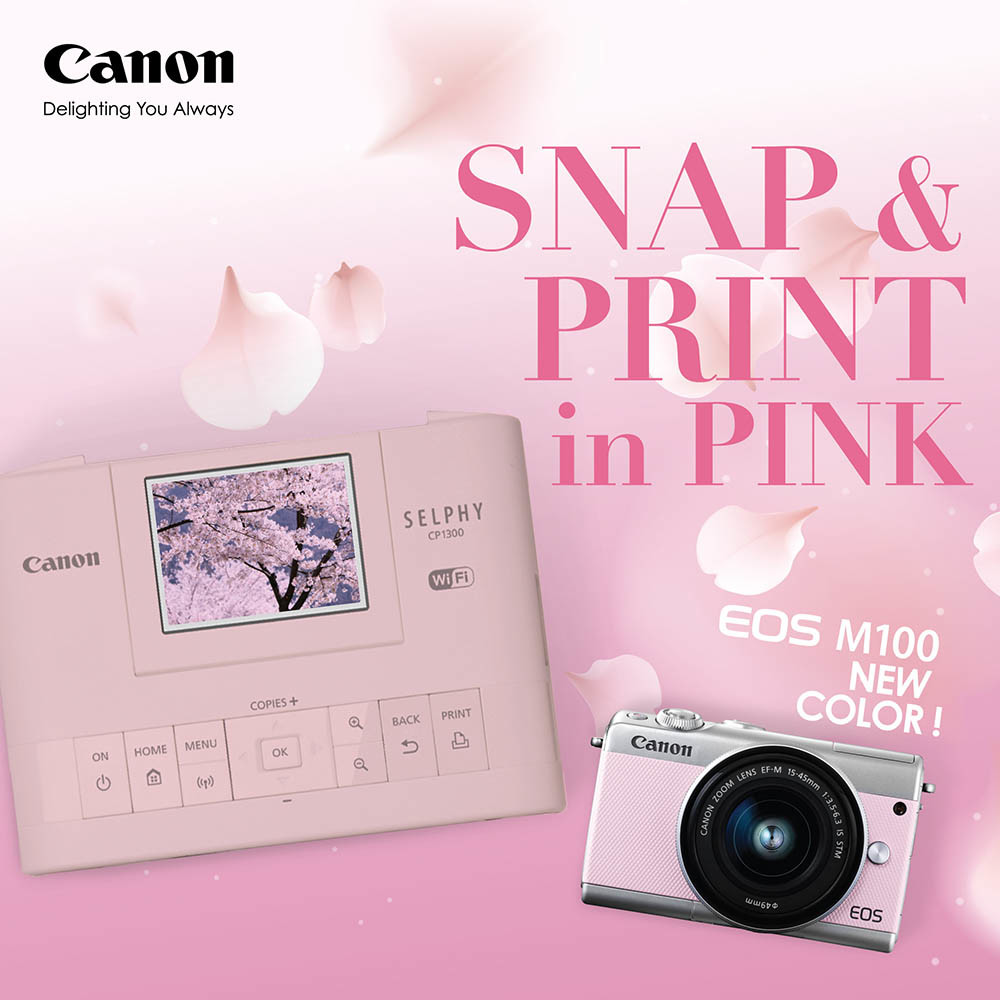 แคนนอน เปิดตัวชุดกล้อง Canon EOS M100 ชุดซากุระพิงค์ กล้องมิเรอร์เลสสุดคิ้วท์ ที่จับคู่มากับปริ้นเตอร์ CP1300 สีชมพูเข้าชุดกัน เอาใจสาวๆ สายหวาน ที่ต้องการกล้องถ่ายรูปที่ใช้งานง่ายและถ่ายภาพเซลฟี่ได้สวยดังใจ