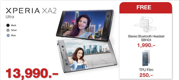 Xperia XA2 Ultra โดดเด่นด้วยกล้องหน้าเซลฟี่เลนส์คู่ “Dual Pro Selfie” ที่มอบคุณภาพภาพถ่ายที่ดีเยี่ยมในทุกมุมมอง ให้คุณเป็นเจ้าของในราคาเพียง 13,990 บาท พร้อมรับฟรีชุดหูฟัง สเตอริโอบลูทูธ มูลค่า 1,990 บาท และฟิล์มกันรอยแบบ TPU