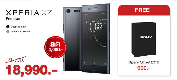 Xperia™ XZ Premium สมาร์ทโฟนที่มอบนิยามแห่งความพรีเมี่ยมด้วยจอแสดงผล 4K HDR ขนาด 5.5 นิ้ว ลดพิเศษ 3,000 บาทภายในงาน เหลือเพียง 18,990 บาท พร้อมรับฟรีชุด Xperia Giftset มูลค่า 990 บาท