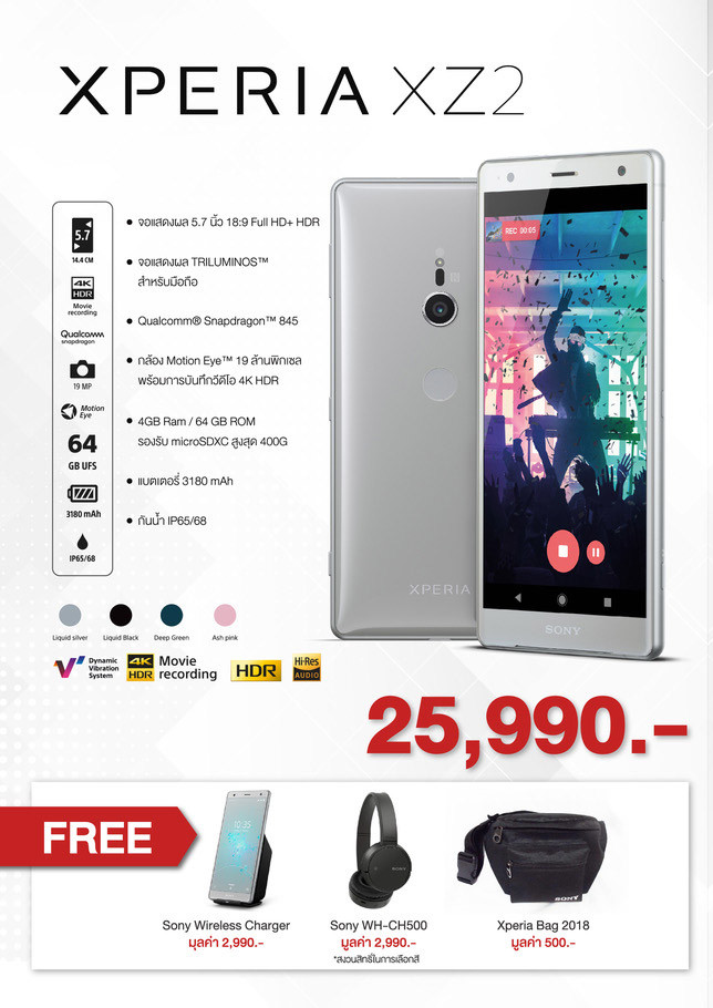 Xperia XZ2 สมาร์ทโฟนที่นำเสนอสุดยอดประสบการณ์ความบันเทิงแก่ผู้ใช้ ภายใต้คอนเซ็ปต์ “Entertainment to the Extreme” ในราคาสุดคุ้มเพียง 25,990 บาท แถมฟรี แท่นชาร์จไร้สาย หูฟังบลูทูธ WH-CH500 และกระเป๋าคาดอก Xperia รวมมูลค่า 6,480 บาท ทันที