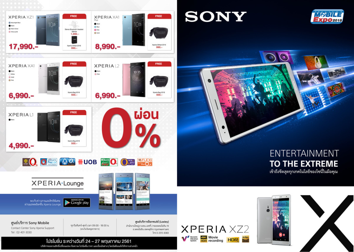 Sony ร่วมจัดแสดงบูธภายในงาน Thailand Mobile Expo 2018 ตั้งแต่วันที่ 24 – 27 พฤษภาคม 2561 ณ ศูนย์ประชุมแห่งชาติสิริกิติ์ นำเสนอสินค้าพรีเมียมพร้อมจัดโปรโมชั่นมากมายให้ผู้บริโภคได้เป็นเจ้าของสมาร์ทโฟน แก็ดเจ็ท และสินค้าไอทีได้ในราคาคุ้มค่าอย่างจุใจ