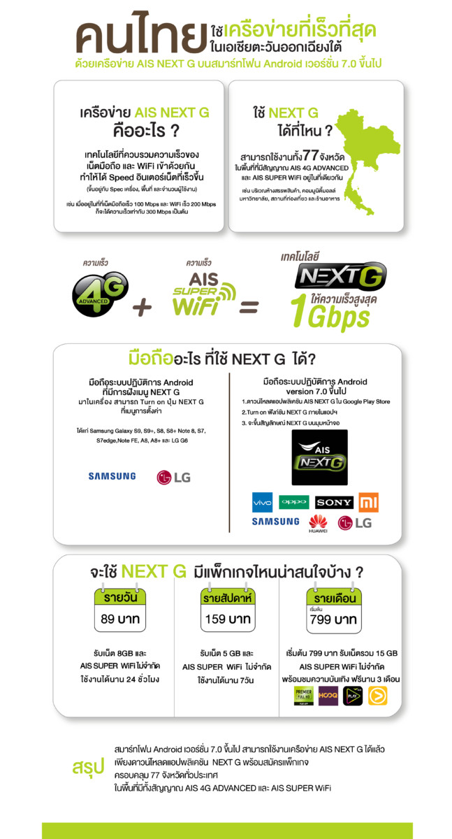 เมื่อปีที่แล้วทาง เอไอเอส ได้เปิดตัว เครือข่าย NEXT G ที่ทำให้อินเทอร์เนตบนสมาร์ทโฟนสามารถทำความเร็วได้ถึงระดับ กิกะบิต (Gbps) จากที่ตอนแรกมีใช้ได้เฉพาะบนสมาร์ทโฟนของ Samsung เพียงบางรุ่น ตอนนี้ AIS NEXT G รองรับใช้งานได้แล้วบนสมาร์ทโฟนระบบแอนดรอยด์ (ที่เป็นเวอร์ชั่น 7.0 ขึ้นไป) อาทิ Huawei, Samsung, Oppo, Vivo, Sony, LG และ Xiaomi