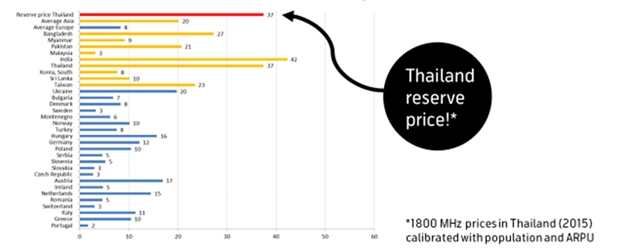 นอกจากนี้ ประเทศไทยยังติดกับดักต้นทุนของคลื่นความถี่ที่สูงระดับโลก เมื่อรวมกับข้อกำหนดกรณีผู้เข้าร่วมประมูลมีจำนวนเท่ากับหรือน้อยกว่าจำนวนใบอนุญาต หรือ N-1 จะนำประเทศไปสู่สภาวะขาดคลื่นความถี่เพื่อนำมาใช้งาน เมื่อเปรียบเทียบกับประเทศในภูมิภาคเดียวกัน ประเทศไทยจ่ายค่าบริการอินเทอร์เน็ตที่สูงกว่าแต่กลับได้ใช้งานความเร็วอินเทอร์เน็ตที่ช้ากว่าประเทศอื่น การตั้งหลักเกณฑ์ที่ไม่เหมาะสมจะนำไปสู่ภาวะการขาดแคลนคลื่นความถี่ในการพัฒนาโครงสร้างพื้นฐาน การใช้งานอินเทอร์เน็ตที่ช้าลง โดยจะส่งผลเสียต่อภาพรวมในการเปลี่ยนผ่านสู่ดิจิทัลของประเทศไทย