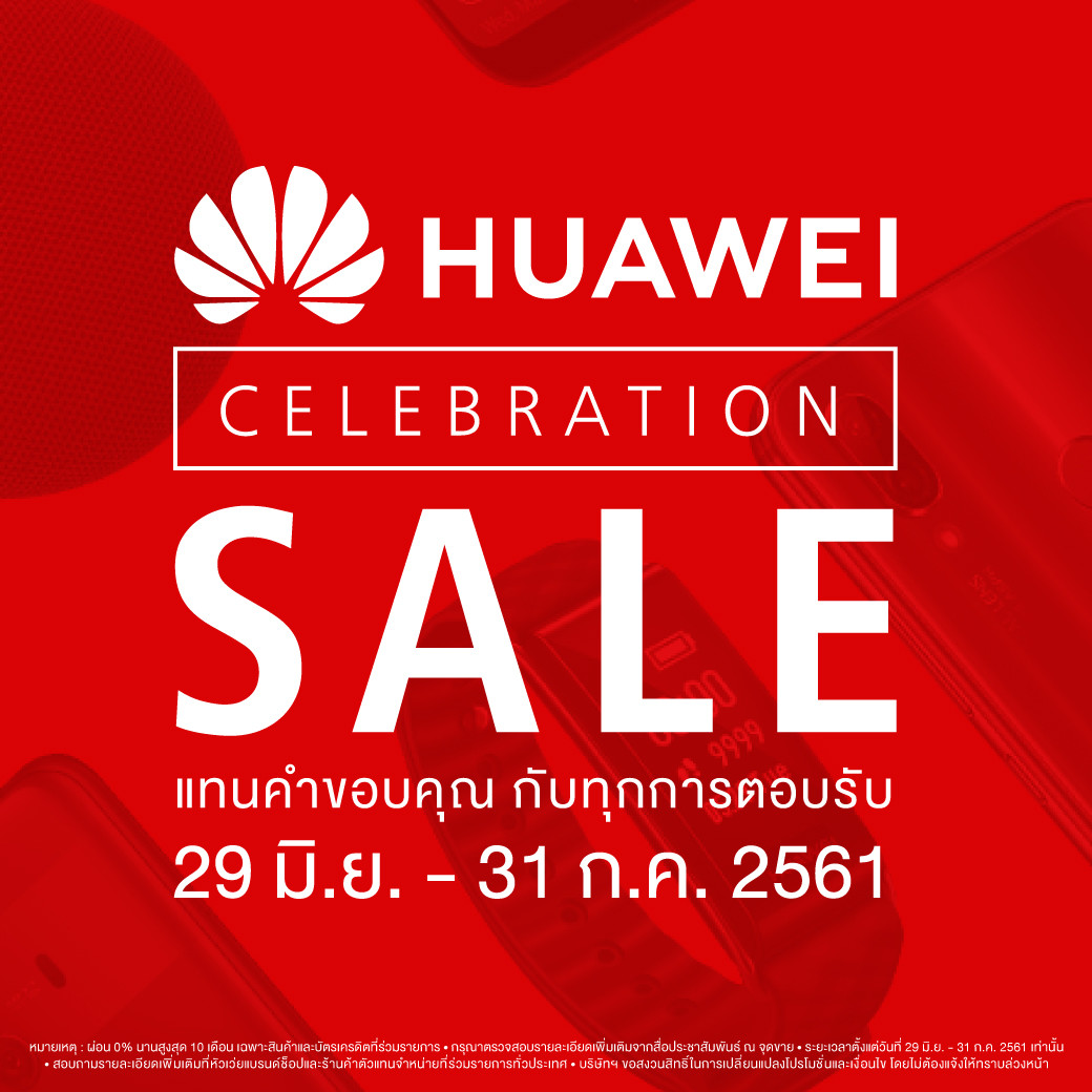 หัวเว่ยแทนคำขอบคุณให้ลูกค้าด้วยการมอบแคมเปญพิเศษ ‘ HUAWEI Celebration Sale ’ ฉลองกลางปี ขนทัพสมาร์ทโฟนและแท็บเล็ตสุดฮิตให้ลูกค้าเป็นเจ้าของในราคาพิเศษ ได้แก่ HUAWE P20 Series, HUAWEI Mate 10 Pro, HUAWEI nova2i, HUAWEI Y9 2018 และ HUAWEI MediaPad T3 10 ตั้งแต่วันนี้ – 31 กรกฎาคม 2561