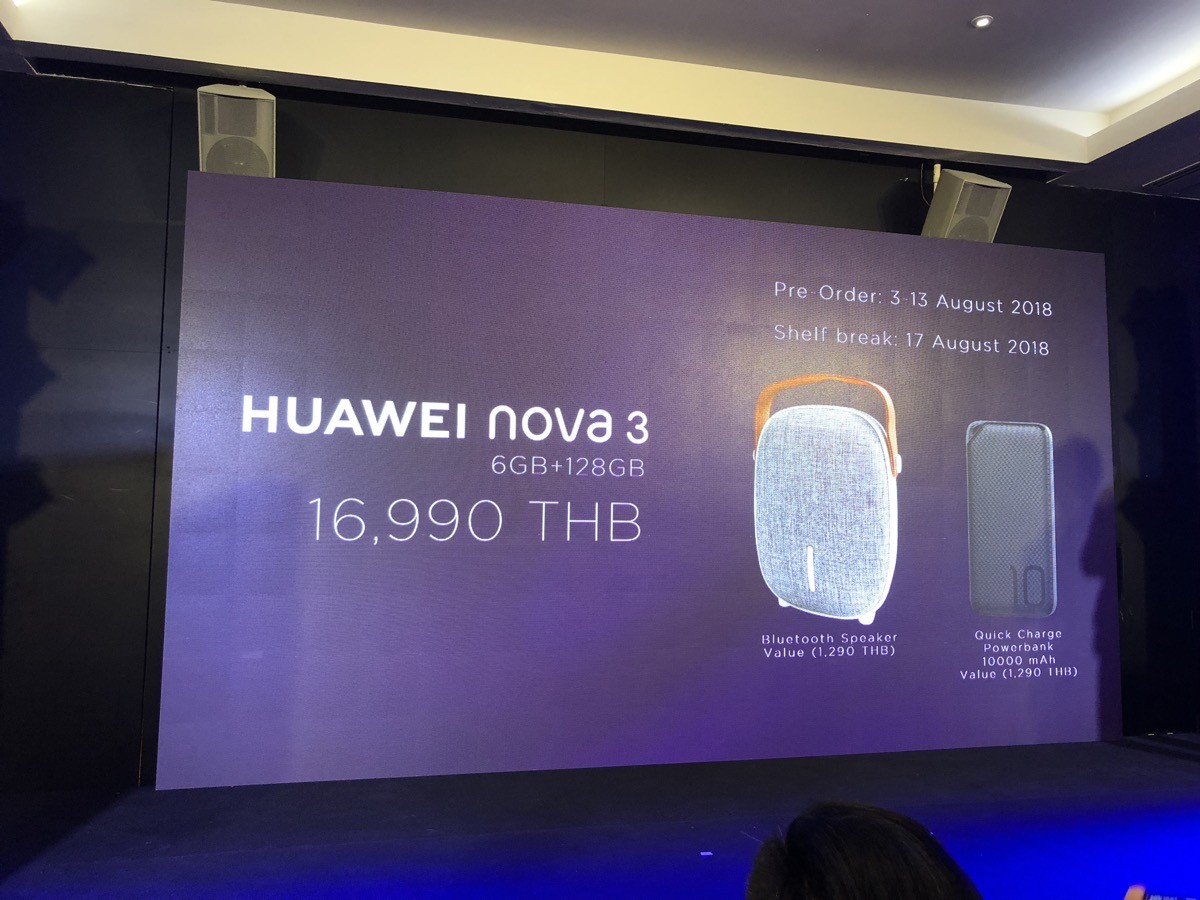Huawei Nova3 ความจุ 128GB | RAM 6GB ราคา 16,990 บาท เปิดให้สั่งจองวันที่ 3-13 สิงหาคมนี้ รับของแถม ลำโพง Huawei Bluetooth Speaker และ Quick Charge Powerbank วางจำหน่ายจริง วันที่ 17 สิงหาคมนี้