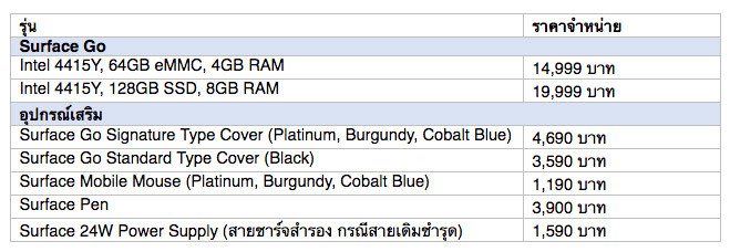 ไมโครซอฟท์ ประเทศไทย เปิดราคา Surface Go น้องเล็กรุ่นล่าสุด เปิดจองล่วงหน้าได้ตั้งแต่วันที่ 2 สิงหาคมเป็นต้นไป ด้วยราคาเริ่มต้นเพียง 14,999 บาท ที่ Banana IT และ IT City หรือทางช่องทางออนไลน์ที่ Microsoft Store ประเทศไทย