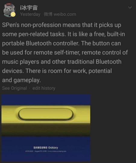 Ice Universe แหล่งข่าวจากประเทศจีนเปิดเผยข้อมูลบนโซเชียลมีเดียเกี่ยวกับฟีเจอร์ใหม่ของ S Pen บนกาแลคซี่โน๊ต 9 ว่าจะเป็นบลูทูธคอนโทรลเลอร์แบบพกพาเนื่องจากจะมีการรองรับการใช้งานกับ Bluetooth ซึ่งปุ่มที่อยู่บนปากกานั้นจะสามารถเรียกใช้งานฟีเจอร์ใหม่ที่เพิ่มเข้ามาอย่าง self-timer และ มิวสิคเพลย์แบคได้จากระยะไกลซึ่งถ้าหากทำได้จริงการตั้งกล้องแล้วใช้ปากกกาเป็นรีโมทกดชัตเตอร์ก็คงอยู่ไม่ไกลแล้ว