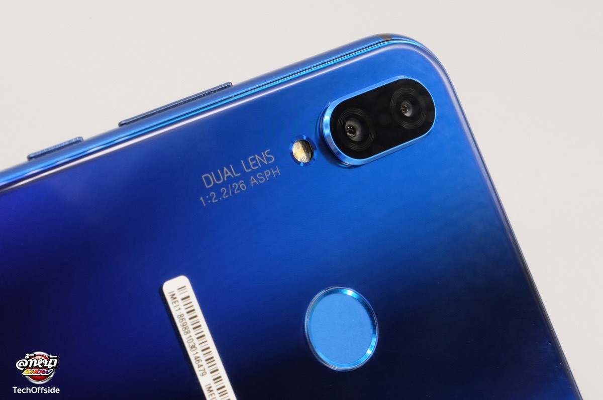 พลิกมาดูด้านหลังเครื่องกัน จะเห็นว่าการวางตำแหน่งของกล้องและเซนเซอร์สแกนลายนิ้วมือจะอยู่ตำแหน่งเดียวกัน โดยตัวกล้องคู่จะอยู่ที่มุมเครื่องด้านบน สแกนลายนิ้วมืออยู่ตรงกลาง ตำแหน่งตรงนิ้วชี้ใช้งานง่ายถนัดมือ และมีโลโก้ HUAWEI อยู่ที่มุมล่าง จุดต่างที่ชัดเจนคือ Nova3 จะออกแบบให้ฝาหลังขอบข้างเป็นโค้งแบบ 3D แต่ที่เหมือนกันและชอบมากคือ ฝาหลังเป็นกระจกที่มีการใช้เทคนิคทำสีไล่เฉดอย่างสวยงามดูมีมิติ