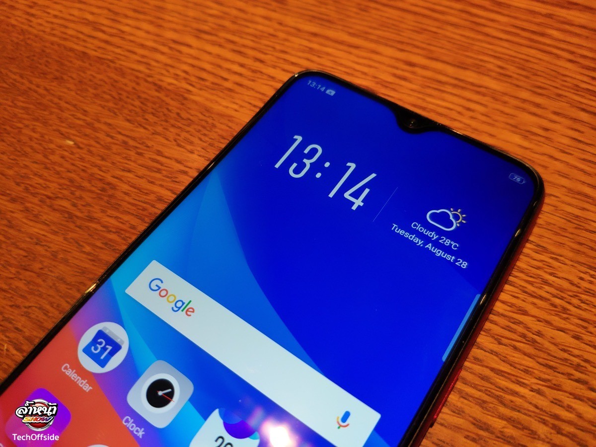 สิ่งแรกที่สะดุดตา กับการออกแบบด้านหน้าของเครื่อง นั่นคือหน้าจอที่ออปโป้เรียกว่า “Water Drop Display” หรือถ้าเรียกชื่อแบบไทยๆ ก็คือ “หน้าจอแบบหยดน้ำ”