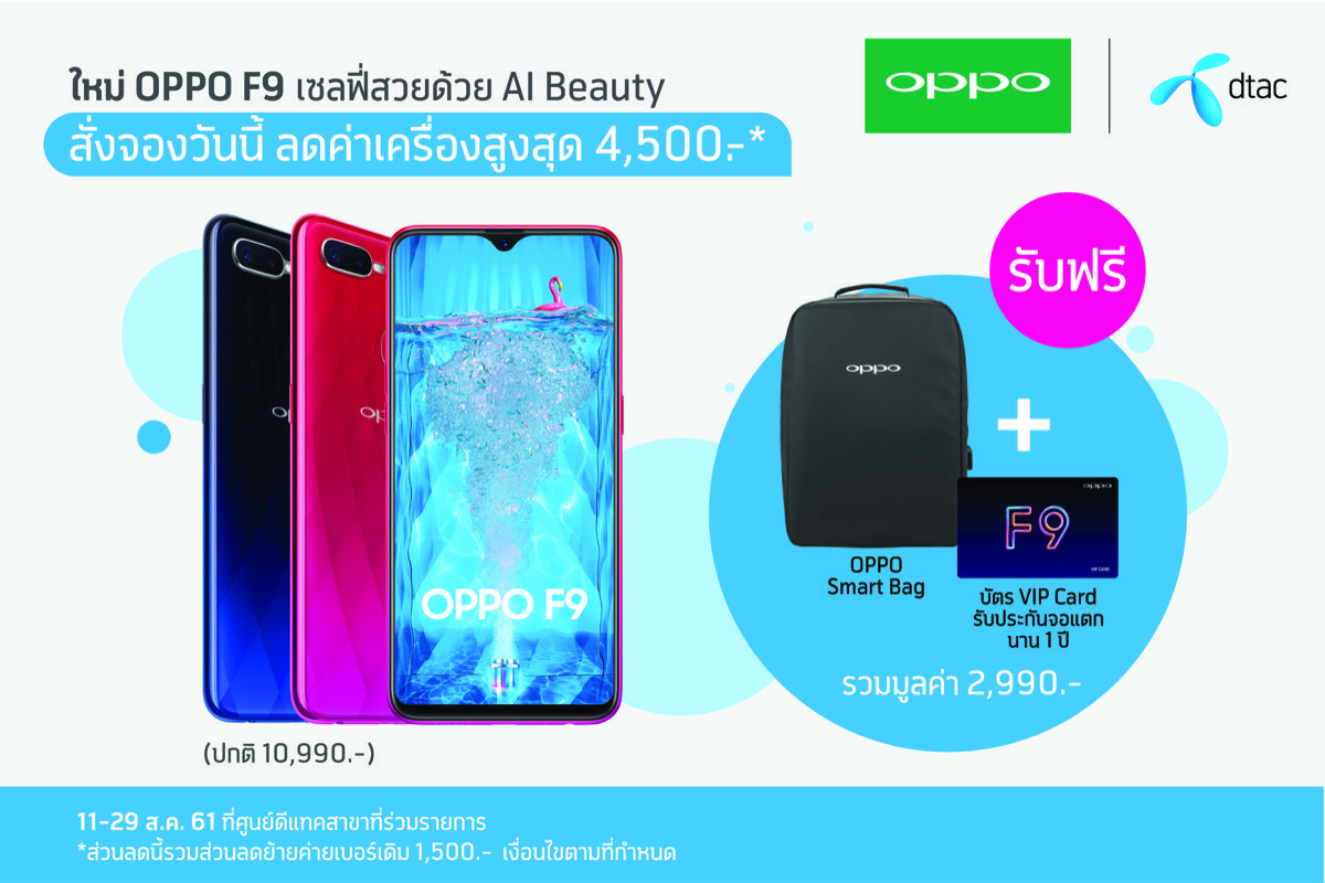 ทางดีแทค เริ่มเปิดจอง OPPO F9 วันที่ 11-29 สิงหาคม 2561 ที่ศูนย์บริการดีแทคที่ร่วมรายการพร้อมรับส่วนลด 3,000 บาท พิเศษลูกค้าย้ายค่ายเบอร์เดิมรับส่วนลดค่าเครื่องเพิ่ม 1,500 บาท รวม ลดสูงสุด 4,500 บาท พิเศษสำหรับลูกค้าที่จองเครื่องภายในช่วงเวลาดังกล่าว รับของสมนาคุณจาก OPPO ดังนี้ OPPO Smart Bag และบัตร VIP CARD รับประกันจอแตกนาน 1 ปี ลูกค้าสามารถติดตามรายละเอียดโปรโมชั่นเพิ่มเติมได้ที่ www.dtac.co.th