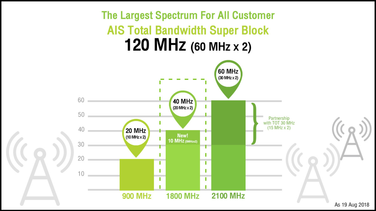 ส่งผลให้เอไอเอสก้าวขึ้นเป็น ผู้ให้บริการที่มีคลื่นความถี่ในการให้บริการโทรศัพท์เคลื่อนที่จำนวนมากที่สุดในอุตสาหกรรม รวมทั้งสิ้น 120 MHz (60 MHz x 2) ประกอบด้วยคลื่นความถี่ที่ได้รับใบอนุญาตจากกสทช. และจากการทำสัญญาโรมมิ่งกับทีโอที ซึ่งเหมาะสมสำหรับการรองรับการใช้งานของลูกค้าทั้งสิ้นกว่า 40 ล้านเลขหมาย และรองรับการขยายตัวของผู้ใช้บริการที่จะมีการใช้งานดาต้าเพิ่มสูงขึ้นเรื่อยๆ รวมทั้ง เพิ่มขีดความสามารถในการแข่งขันให้กับบริษัทสามารถสร้างโอกาสและต่อยอดนวัตกรรมเทคโนโลยีใหม่ๆ ได้อย่างไร้ขีดจำกัด