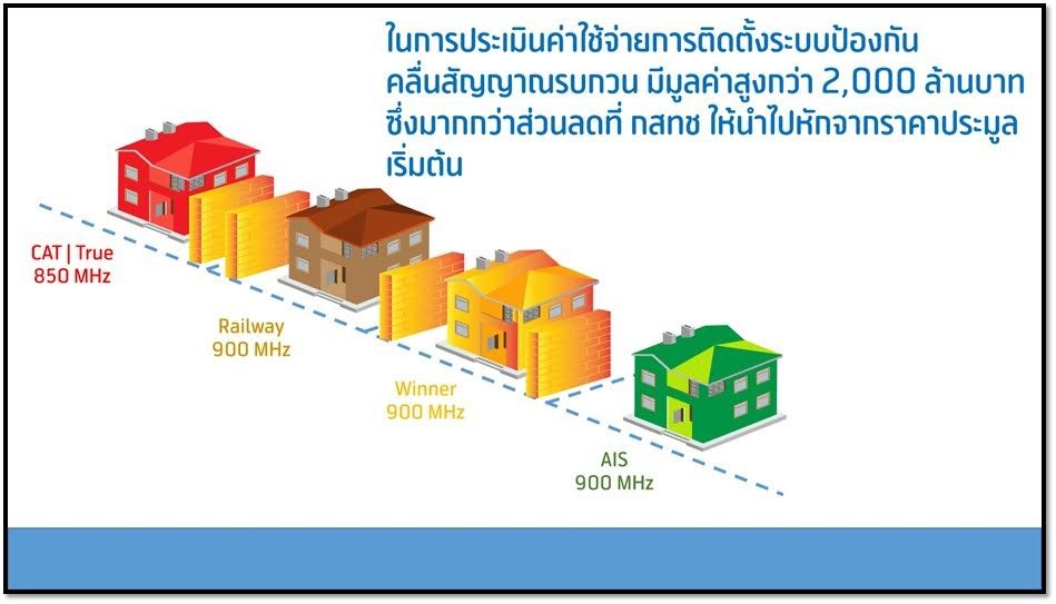 โดยประกาศหลักเกณฑ์การประมูลคลื่นความถี่ดังกล่าวที่ประกาศลงในราชกิจจานุเบกษา เมื่อวันที่ 9 กรกฎาคม ระบุให้ผู้ชนะการประมูลใบอนุญาตคลื่น 900 MHz จะต้องมีหน้าที่รับผิดชอบในการป้องกันและแก้ไขปัญหาการรบกวนกันของคลื่นความถี่และการรบกวนระบบอาณัติสัญญาณของระบบคมนาคมขนส่งทางรางทั้งหมดที่จะสร้างขึ้นต่อไปในอนาคตแต่เพียงผู้เดียว นอกจากนั้น กสทช. ยังขอสงวนสิทธิ์ที่จะปรับเปลี่ยนการใช้คลื่นความถี่เป็นช่วง 885-890/930-935 MHz ในกรณีที่จำเป็น โดยผู้ชนะการประมูลจะต้องมีหน้าที่รับผิดชอบดำเนินการป้องกันการรบกวนคลื่นความถี่ ซึ่งในกรณีจะต้องติดตั้งวงจรกรองสัญญาณ (filter) ณ สถานีฐานของผู้รับใบอนุญาตให้ใช้คลื่นความถี่ย่าน 900 MHz เพิ่มเติมจากที่ต้องดำเนินการในกรณีแรก ทำให้เกิดผลกระทบต่อความเสี่ยงและความไม่แน่นอนในการดำเนินงานของผู้ชนะใบอนุญาตคลื่น 900 MHz