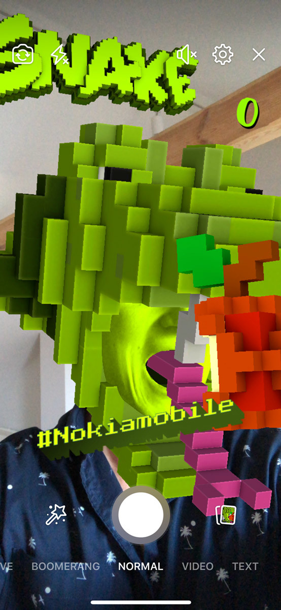 โนเกีย ส่งเกมงูสู่มือผู้ใช้งานอินเทอร์เน็ตอีกครั้งบนแพลตฟอร์มกล้อง AR ตัวใหม่ของ Facebook เกมงูสุดคลาสสิกบนโทรศัพท์มือถือของโนเกีย กลับมาสร้างกระแสอีกครั้งในเวอร์ชั่นใหม่บนสมาร์ทโฟน ผ่านแพลตฟอร์มกล้อง AR ของ Facebook ที่มาพร้อมกับฟิลเตอร์ Snake Mask และ Snake Real Worldให้เลือกในโหมดหลายผู้เล่น (multiplayer) ด้วยการผสานเทคโนโลยี AR (Augmented Reality)