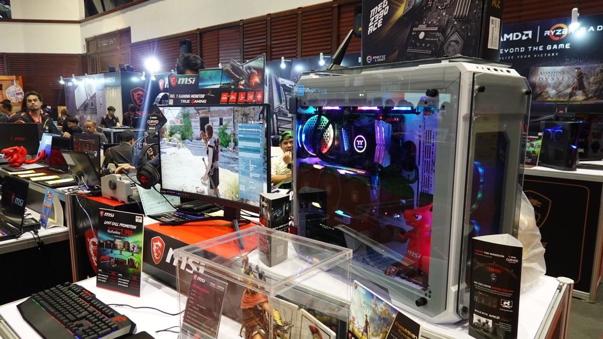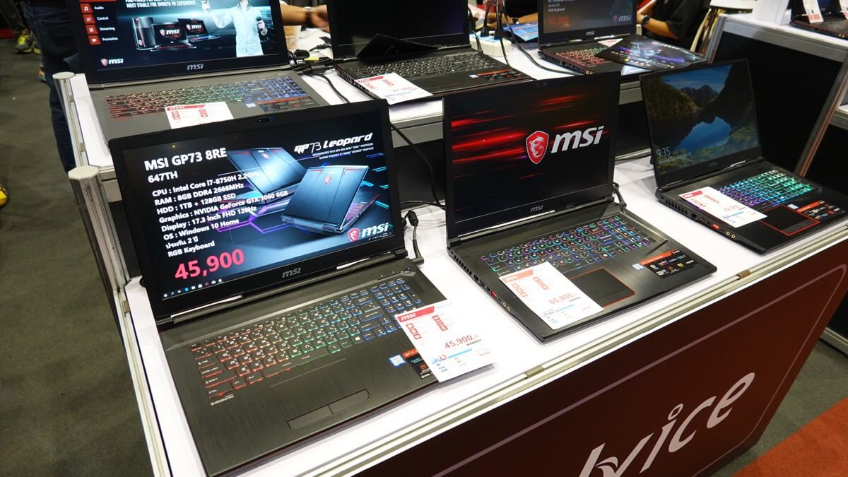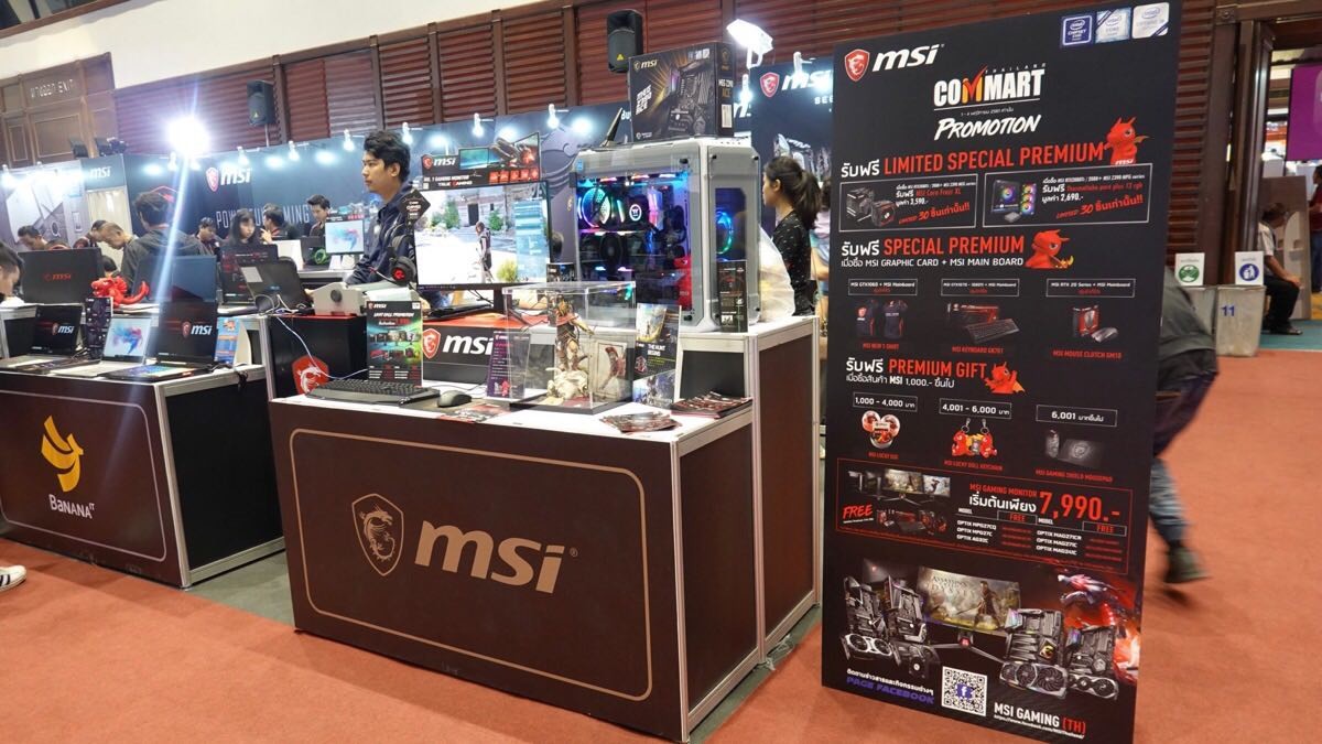 ในเพลนเนรี่ฮอลล์ยังมีบูธของ MSI อันนี้สำหรับคอเกมอีกเช่นกัน มีรุ่นให้เลือกตั้งแต่ตัวระดับเริ่มต้น ไล่ไปยันสเปคเทพ หรือจะเป็นเดสก์ท็อปประกอบไฟ RGB เท่ๆ ก็มีให้เลือกด้วยเช่นกัน