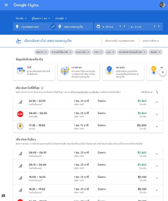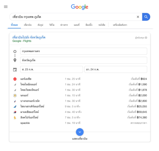 ความสะดวกสบาย สำหรับคนที่ต้องการหาตั๋วเครื่องบินราคาถูก ที่ตอนนี้สามารถเข้าที่ Google Search เพื่อค้นหาเที่ยวบินที่ดีที่สุดให้กับคุณ สามารถเลือกเปรียบเทียบและจองตั๋วเครื่องบินได้อย่างรวดเร็ว ง่ายดาย ผ่านทางอุปกรณ์ต่างๆ ได้ทั้ง สมาร์ทโฟน, แท็บเลต หรือบนคอมพิวเตอร์ โดยการแสดงรายละเอียดจะเป็นภาษาไทย และราคาก็จะเป็นสกุลเงินบาท