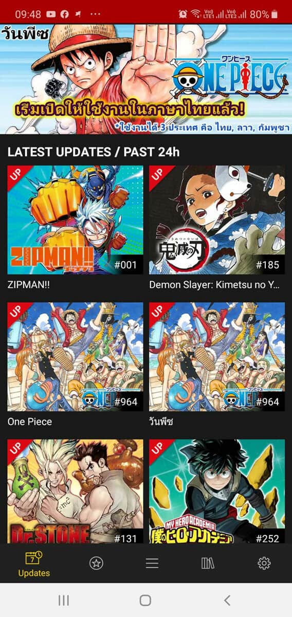 อัปเดตล่าสุด เป็นข่าวดีสำหรับแฟนๆ การ์ตูนชาวไทย เพราะในแอปเริ่มมีการ์ตูนที่แปลไทยให้ โดยเริ่มด้วย 2 เรื่องดังคือ One Piece และ My Hero Academia ซึ่งจะมีตอนใหม่ล่าสุด แปลเป็นไทยให้ได้อ่านพร้อมกับใน Shonen Jump กันเลย