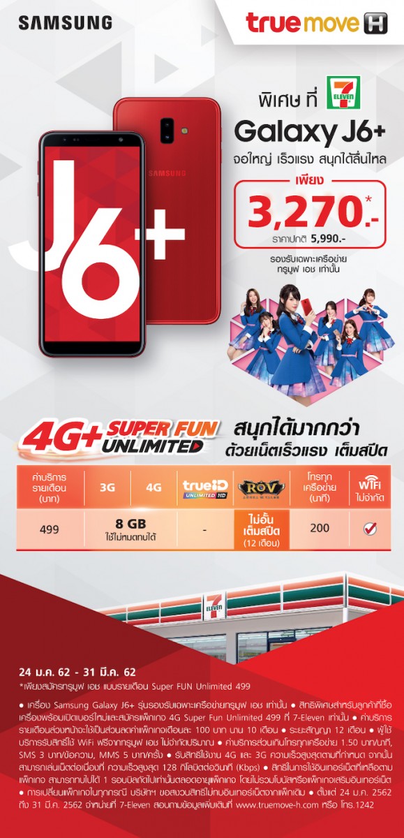 Samsung Galaxy J6+ สมาร์ทโฟนจอใหญ่ สเปคแรง ลงวางจำหน่ายที่ ร้าน 7-Eleven ในราคาพิเศษเพียง 3,270 บาท (จากราคาปกติ 5,990 บาท) เพียงสมัครแพ็กเกจ ทรูมูฟ เอช 4G Super FUN Unlimited 499 นาน 12 เดือน สนุกได้มากกว่าด้วยเน็ตเร็วแรง ลื่นไหลไม่สะดุด เต็มสปีดถึง 8 GB พร้อม WiFi ฟรีไม่จำกัดปริมาณ เอาใจคอเกมสุดฮิต เล่น ROV ได้แบบไม่อั้น! อีกทั้งข้อเสนอสุดพิเศษ รับส่วนลดค่าบริการรายเดือน 100 บาท นาน 10 เดือน รวมมูลค่ากว่า 1,000 บาท โดยพร้อมวางจำหน่ายอย่างเป็นทางการที่ร้าน 7-Eleven ตั้งแต่วันที่ 24 มกราคม ถึง 31 มีนาคม 2562 เท่านั้น!