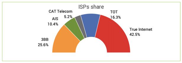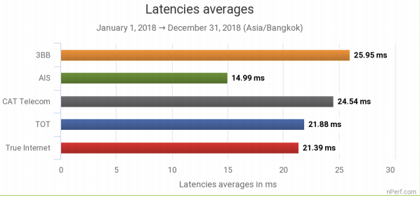 ค่าเฉลี่ย latncy ของอินเทอร์เนตแบบ Fixed Braodband ของไทย อยู่ที่ 22ms โดย AIS มีค่าความหน่วงเฉลี่ยน้อยที่สุด ที่ 14.99ms ตามมาด้วย True Internet ที่ 21.39ms และ TOT 21.88ms