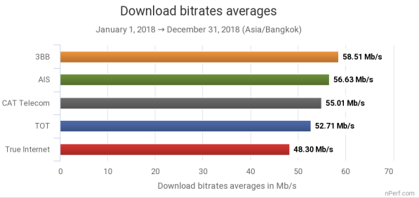 ในส่วนของการดาวน์โหลด ค่าเฉลี่ยของประเทศไทยอยู่ที่ 53 Mb/s โดย 3BB ทำความเร็วได้มากสุดเป็นอันดับ 1 ที่ 58.51 Mb/s ตามมาด้วย AIS 56.63 Mb/s และ CAT ที่ 55.01 Mb/s