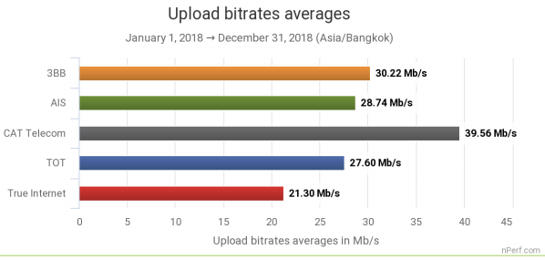 ค่าเฉลี่ยการอัพโหลดของประเทศไทย อยู่ที่ 26 Mb/s เมื่อเทียบสถิติของปี 2017 ถือว่าทำความเร็วเพิ่มขึ้นกว่า 70% โดย AIS และ CAT เป็นผู้ให้บริการที่มีการค่าความเร็วเฉลี่ยเพิ่มขึ้นมากที่สุด