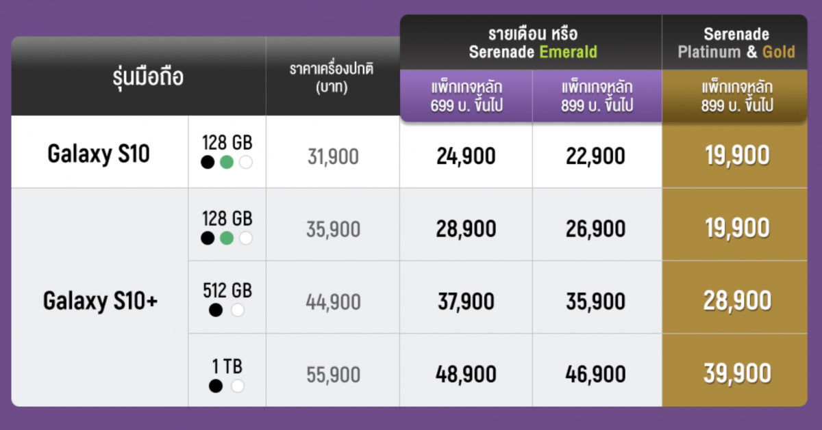 - รับส่วนลดค่าเครื่องสูงสุด 50% เหลือเพียง 17,950 บาท จากราคาปกติ 35,900 บาท เมื่อจอง Samsung Galaxy S10+ (128 GB) พร้อมสมัครแพ็กเกจ AIS HOT DEAL 1,299 บาทขึ้นไป และชำระค่าบริการล่วงหน้า 8,000 บาท