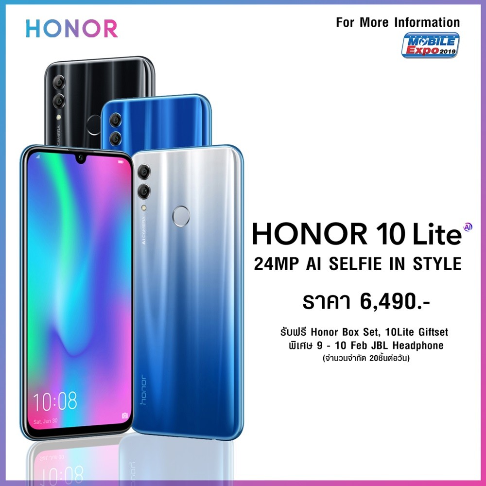 สมาร์ทโฟนเน้นเซลฟี่ ด้วยกล้องหน้าความละเอียด 24 ล้านพิกเซล พร้อมระบบ AI หน้าจอใหญ่ 6.2 นิ้วแบบ Dewdrop มาพร้อมกับ Android 9.0 เวอร์ชั่น่าสุด เปิดราคาเริ่มต้นที่ 6,490 บาท รับฟรีทันที! HONOR Box Set และชุดของขวัญ HONOR 10 Lite Giftset พิเศษสุด! เฉพาะวันที่ 9 -10 กุมภาพันธ์ ลุ้นรับหูฟัง JBL (จำนวนจำกัด 20 ชิ้นต่อวัน)